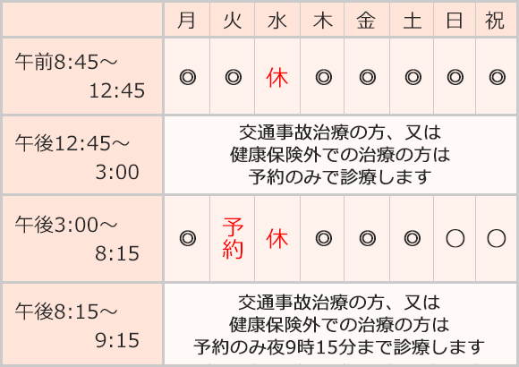 | 月~土 | 午前 8:45 ~ 12:45 午後 3:00 ~ 8:15 (交通事故・予約の方は 9:15 まで) |